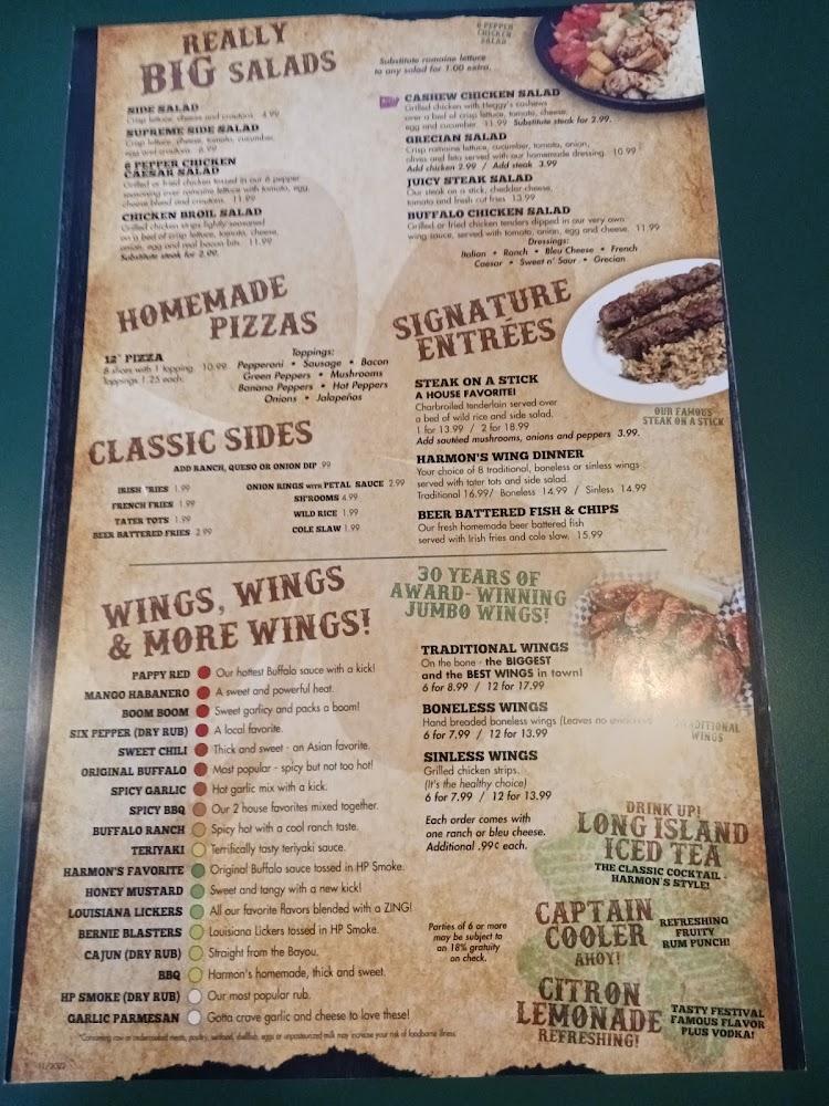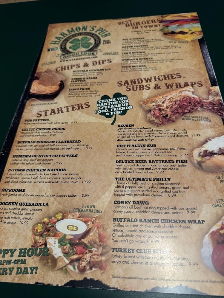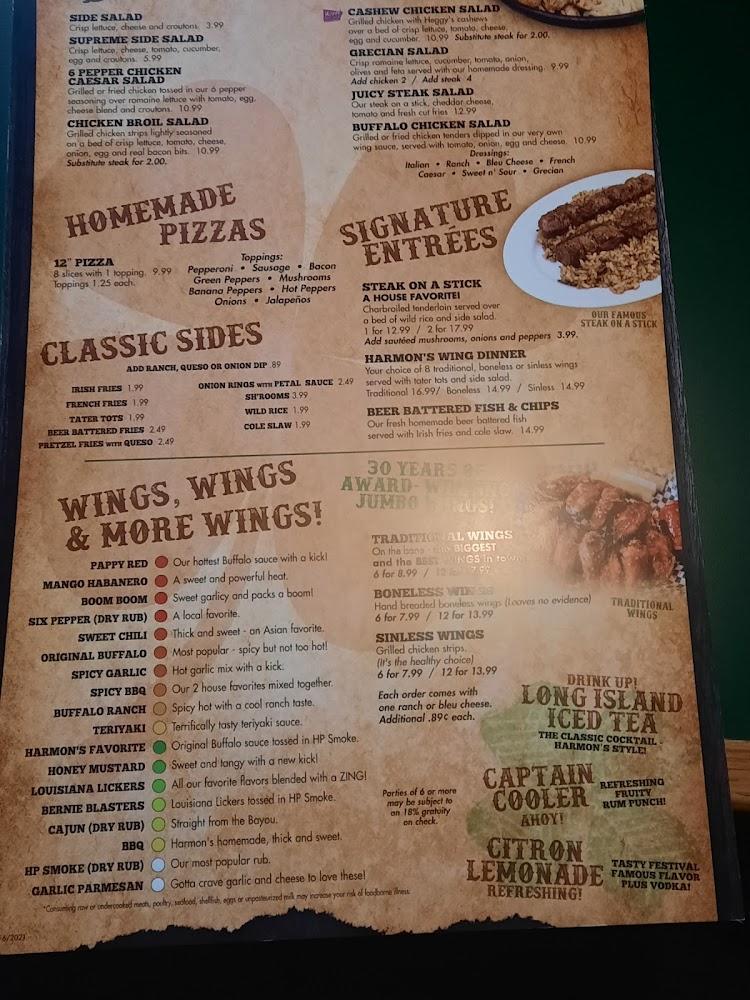 The menu at Harmon's features a great variety. Start with appetizers like buffalo chicken flatbread or Celtic cheese curds. The offerings keep things interesting with daily specials and a rotating selection of draft beers.